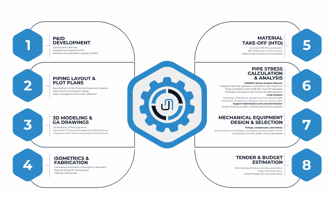 We specialize in mechanical and piping stress engineering, including: Piping stress analysis (CAESAR II, AutoPIPE) Pipe support design Static equipment checks 3D modeling & isometric review Technical documentation and reports Site survey and as-built verification